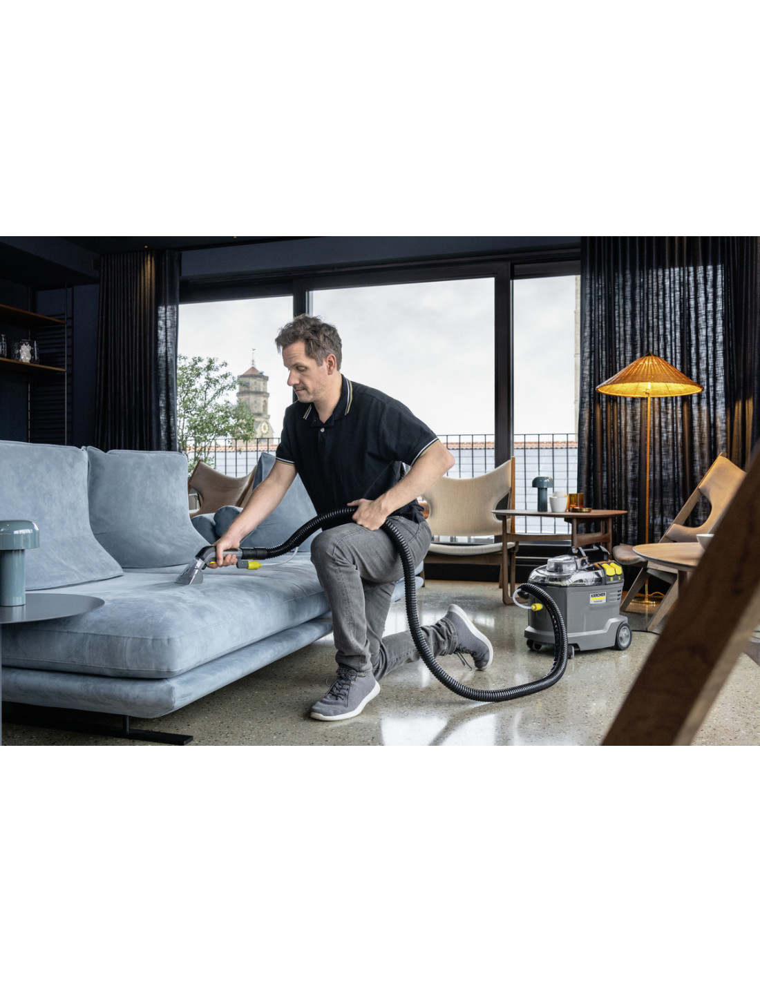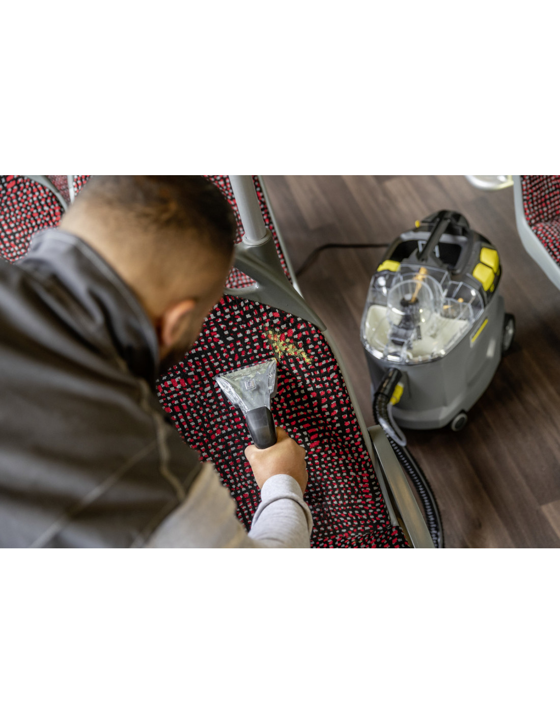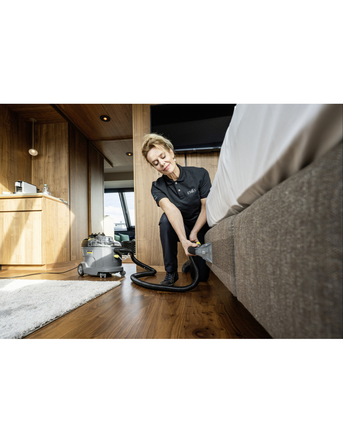 Robusto, de larga vida útil y eficiente: el lava-aspirador Puzzi 8/1 de Kärcher impresiona por sus excelentes e higiénicos resultados de limpieza y por su alta rentabilidad en la limpieza de tapicerías y en la eliminación de manchas en superficies textiles. El lava-aspirador compacto pulveriza la solución de limpieza profundizando en las fibras textiles y, a continuación, la vuelve a aspirar junto con la suciedad disuelta. Este excelente rendimiento de reaspiración también garantiza un secado rápido y la posibilidad de volver a utilizar de inmediato las superficies textiles, lo que resulta ideal para las elevadas exigencias de los profesionales de la limpieza en el sector de la hostelería o en la limpieza de interiores de vehículos. A esto se suma la boquilla para tapicerías de serie extracorta, que permite limpiar cómodamente y de forma ergonómica en zonas estrechas. Gracias a su peso reducido y al asa de transporte ergonómica, el lava-aspirador puede transportarse fácilmente con una sola mano. Los pulsadores de gran tamaño, que se pueden accionar con la mano o con el pie, también aumentan la comodidad del usuario. Para ver mejor la suciedad, la tapa del equipo y la boquilla manual son transparentes.