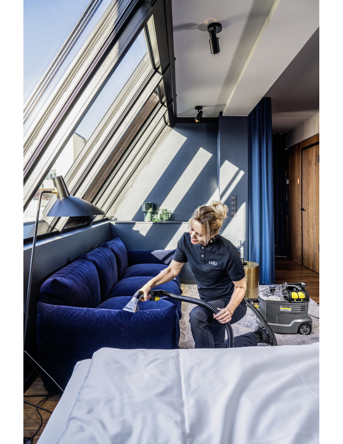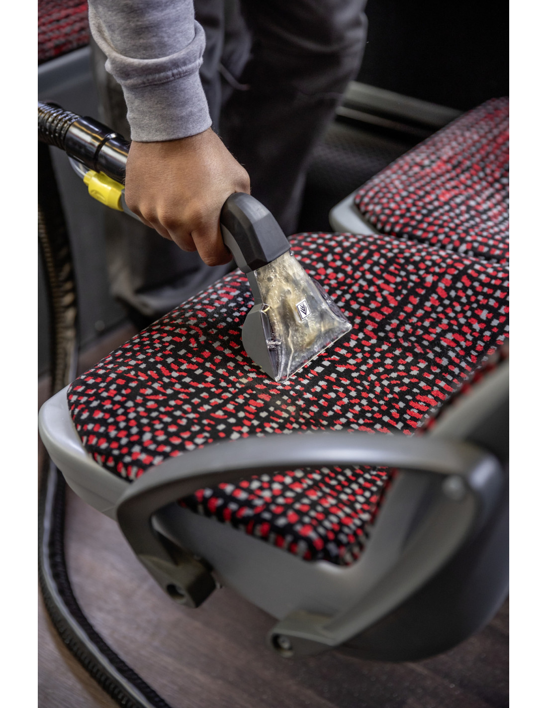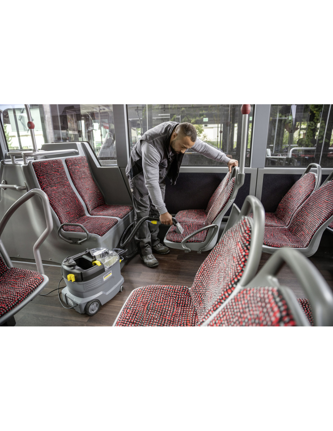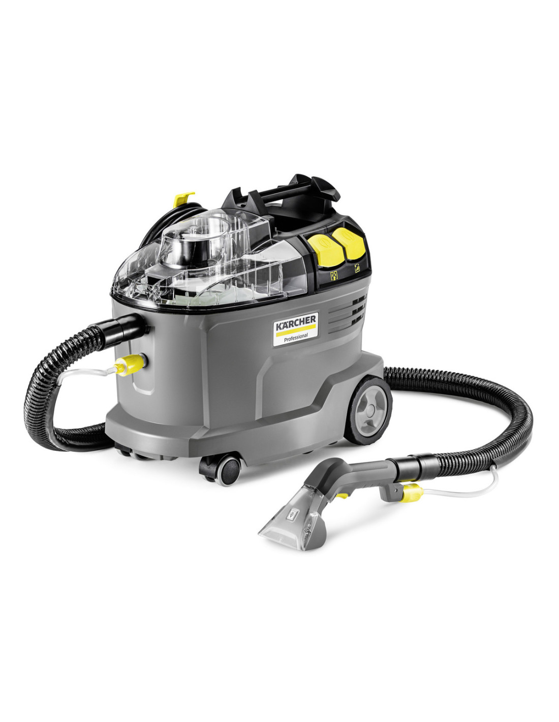Robusto, de larga vida útil y eficiente: el lava-aspirador Puzzi 8/1 de Kärcher impresiona por sus excelentes e higiénicos resultados de limpieza y por su alta rentabilidad en la limpieza de tapicerías y en la eliminación de manchas en superficies textiles. El lava-aspirador compacto pulveriza la solución de limpieza profundizando en las fibras textiles y, a continuación, la vuelve a aspirar junto con la suciedad disuelta. Este excelente rendimiento de reaspiración también garantiza un secado rápido y la posibilidad de volver a utilizar de inmediato las superficies textiles, lo que resulta ideal para las elevadas exigencias de los profesionales de la limpieza en el sector de la hostelería o en la limpieza de interiores de vehículos. A esto se suma la boquilla para tapicerías de serie extracorta, que permite limpiar cómodamente y de forma ergonómica en zonas estrechas. Gracias a su peso reducido y al asa de transporte ergonómica, el lava-aspirador puede transportarse fácilmente con una sola mano. Los pulsadores de gran tamaño, que se pueden accionar con la mano o con el pie, también aumentan la comodidad del usuario. Para ver mejor la suciedad, la tapa del equipo y la boquilla manual son transparentes.